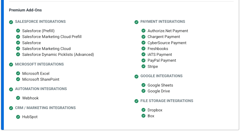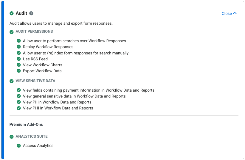 The Licensing & Usage page displays information about the licenses and add-ons available to your FormAssembly instance, and usage information for permission packages and Advanced Document Generation.