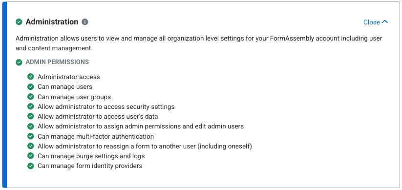 As an administrator of your FormAssembly instance, you can add, deactivate, restore, or edit users. You are also able to set and refine the permissions available to your users.